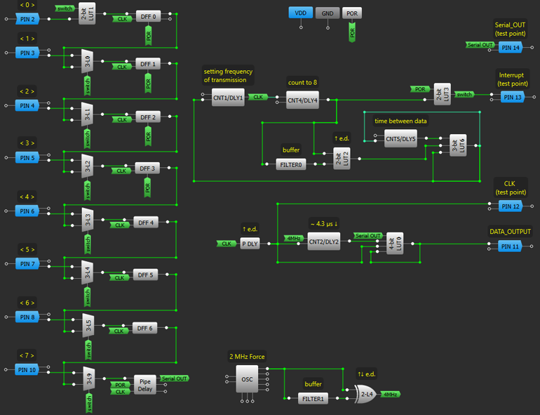 CNT1計(jì)數(shù)器定義了傳輸信號(hào)時(shí)間(如前所述,設(shè)置為?5 μs)。CNT4計(jì)數(shù)器形成八個(gè)這樣的時(shí)間段的數(shù)據(jù)包,并使用2LUT3反相器控制2LUT1、3LUT0÷3LUT53LUT9多路復(fù)用器。當(dāng)來(lái)自2LUT3反相器輸出的內(nèi)部開(kāi)關(guān)信號(hào)為低電平時(shí)(圖7,中斷信號(hào)),則通過(guò)多路復(fù)用器記錄來(lái)自輸入PIN8,#10的信息執(zhí)行相應(yīng)的觸發(fā)器。然后,當(dāng)“ switch”中斷信號(hào))信號(hào)變高時(shí),觸發(fā)器上的數(shù)據(jù)發(fā)生移位,并形成一個(gè)串行代碼(圖7,“ Serial_OUT”信號(hào))