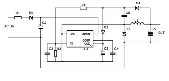 這使設(shè)計人員能夠利用一個可用于隔離式(圖3)和非隔離式(圖4)反激式設(shè)計的器件來解決40W左右的低功耗離線輔助電源設(shè)計的高端問題。