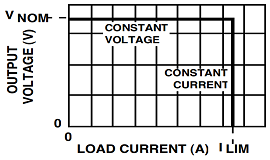 一旦電力系統(tǒng)中的組件進(jìn)入飽和狀態(tài)(即,一旦負(fù)載電阻太低),為了安全起見(jiàn),系統(tǒng)將需要進(jìn)入恒定電流模式,并且系統(tǒng)應(yīng)具有限流輸出。下面顯示了針對(duì)這種情況的理想系統(tǒng)負(fù)載線。實(shí)際負(fù)載線在低負(fù)載電阻下會(huì)有一些下降,并且系統(tǒng)應(yīng)突然進(jìn)入電流限制狀態(tài)。