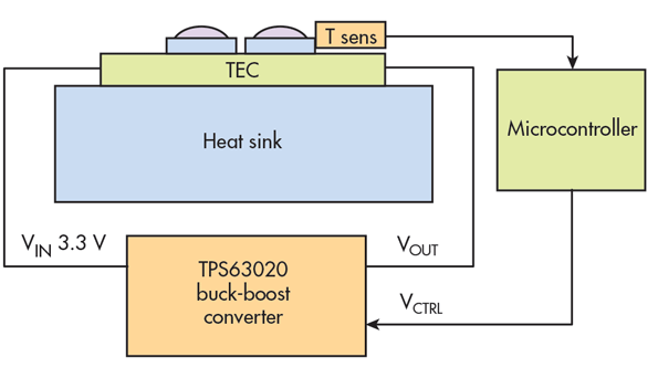 在整個(gè)系統(tǒng)(圖3)中,微控制器(MCU)監(jiān)視TEC上的溫度傳感器。根據(jù)TEC的實(shí)際溫度與所需溫度(設(shè)定點(diǎn)),MCU調(diào)整控制信號(hào)(CTRL),以將降壓-升壓轉(zhuǎn)換器移至新的工作點(diǎn),以提供或吸收更多或更少的電流來(lái)調(diào)整溫度。