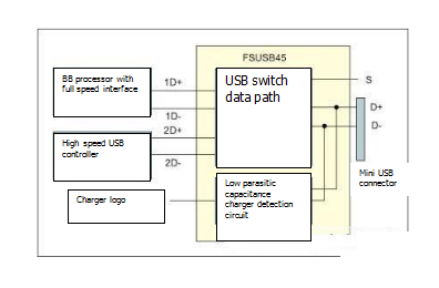 在這些應(yīng)用中,需要具有超低內(nèi)部電容檢測電路的USB開關(guān)來實現(xiàn)充電器隔離和全速USB控制器輸出電容器的隔離。同時,用于確定將哪個USB通道用作輸出的USB通道選擇引腳(圖2中的S引腳)必須識別1.8 V3 V邏輯輸入(注意:基帶中的1.8 V3 V處理器的GPIO輸出非常普遍)。