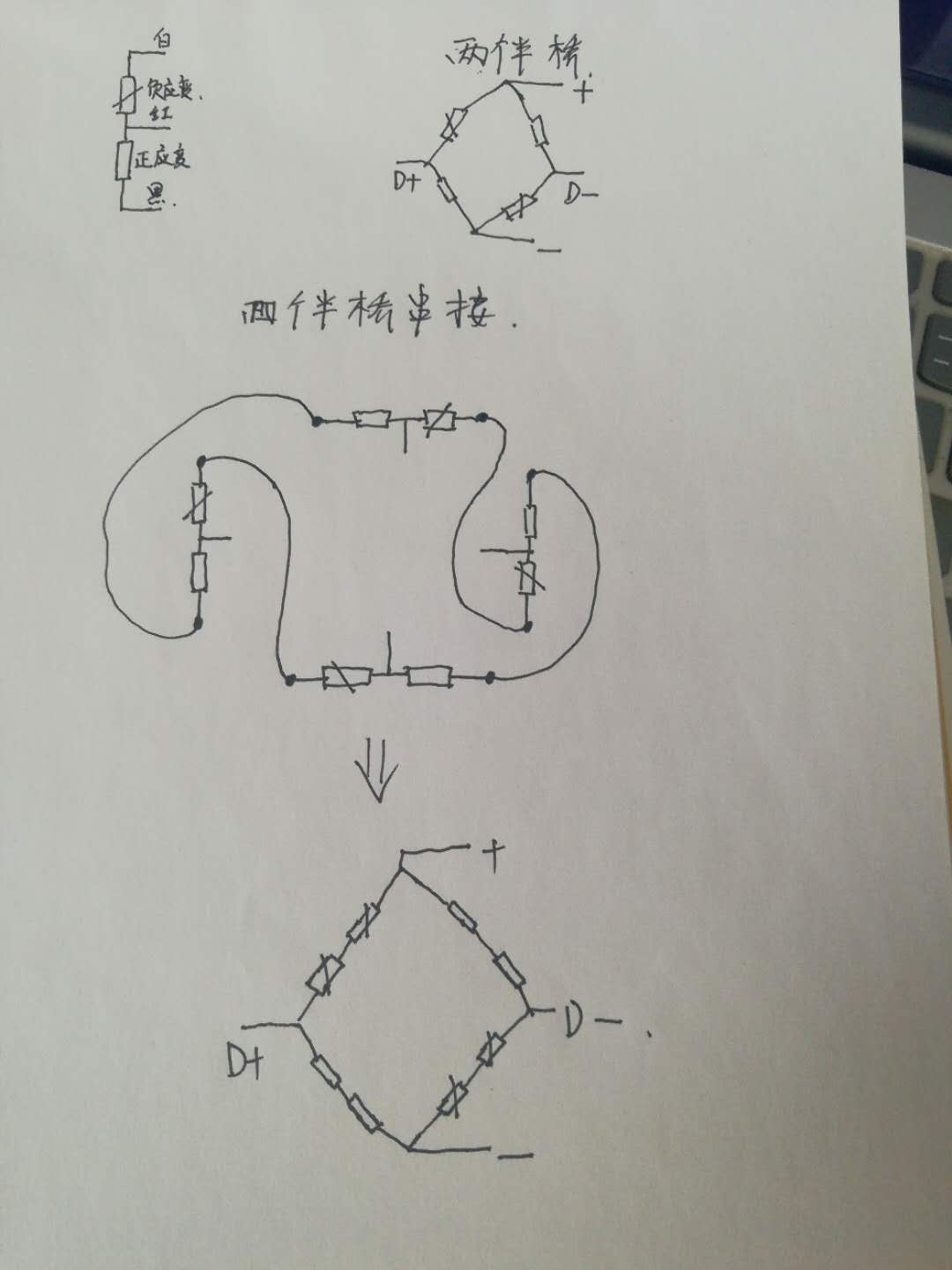 現(xiàn)在需要將四個(gè)半橋稱重傳感器串接在一起,我們要注意接法。其原理是將負(fù)應(yīng)變電阻兩個(gè)接在一起,正應(yīng)變電阻兩個(gè)接在一起,剛好有4組電阻:兩組正應(yīng)變、兩組負(fù)應(yīng)變,可以組成一個(gè)全橋。如下圖是我手繪的全橋稱重傳感器接法: