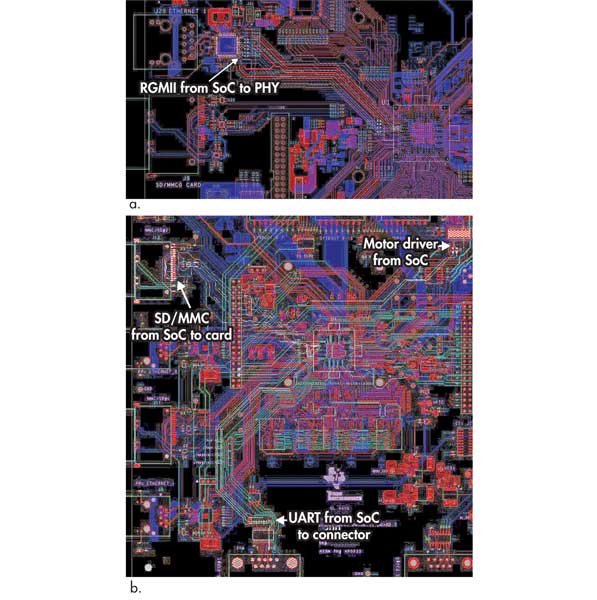 1. SoC連接來自同一組引腳的不同功能信號集的能力可能會在PCB布局上產生很大差異。這些布局顯示了同一SoC的兩種不同實現(xiàn)之間布線差異的示例。在第一個示例中,引腳用于UARTSD / MMC卡,GPIO和電機控制。在第二個示例中,相同的引腳用于RGMII以太網PHY連接。